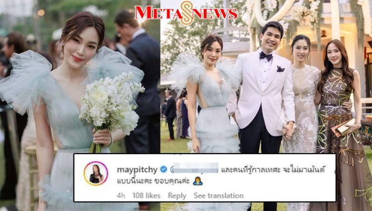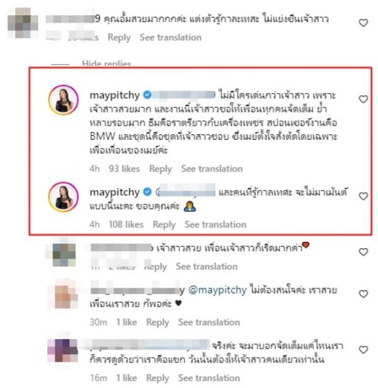 สาวเมย์ ไม่ปล่อยผ่าน เมนต์ดังกล่าว ฟาดกลับเจ็บๆ “ไม่มีใครเด่นกว่าเจ้าสาว เพราะเจ้าสาวสวยมาก และงานนี้เจ้าสาวขอให้เพื่อนทุกคนจัดเต็ม ย้ำหลายรอบมาก ธีมคือราตรียาวกับเครื่องเพชร สปอนเซอร์งานคือ BMW และชุดนี้คือชุดที่เจ้าสาวชอบ ซึ่งเมย์ตั้งใจสั่งตัดโดยเฉพาะเพื่อเพื่อนของเมย์ค่ะ และคนที่รู้กาลเทศะ จะไม่มาเมนต์แบบนี้นะคะ ขอบคุณค่ะ”
