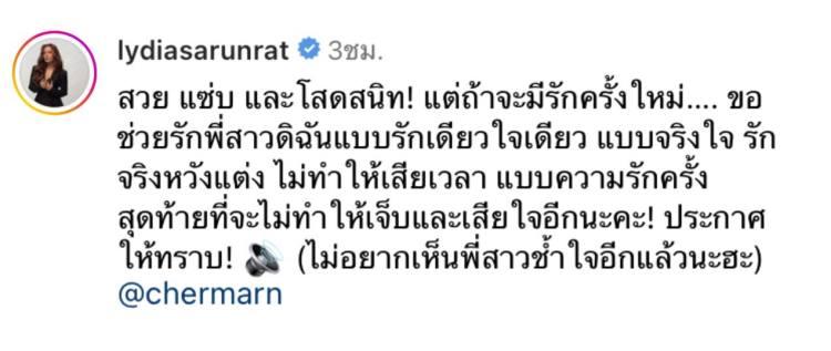 “สวย แซ่บ และโสดสนิท! แต่ถ้าจะมีรักครั้งใหม่…. ขอช่วยรักพี่สาวดิฉันแบบรักเดียวใจเดียว แบบจริงใจ รักจริงหวังแต่ง ไม่ทำให้เสียเวลา แบบความรักครั้งสุดท้ายที่จะไม่ทำให้เจ็บและเสียใจอีกนะคะ! ประกาศให้ทราบ! 🔊 (ไม่อยากเห็นพี่สาวช้ำใจอีกแล้วนะฮะ) @chermarn”