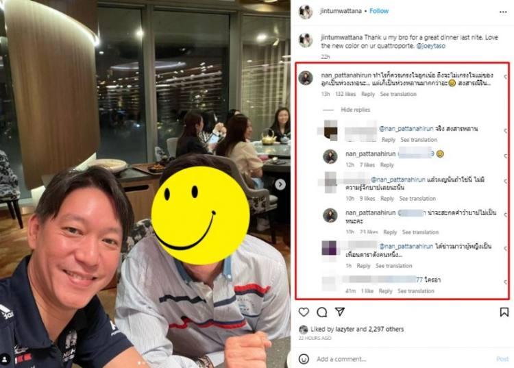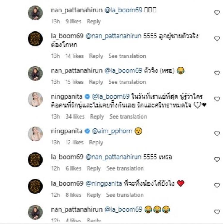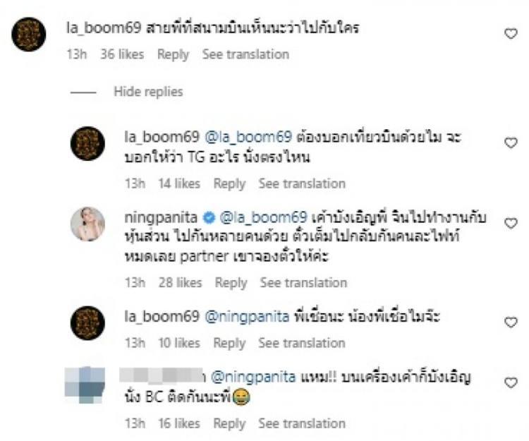 นอกจากนี้ยังมีคนสนิท จิน-หนิง คอมเมนต์บอกว่า “สายพี่ที่สนามบินเห็นนะว่าไปกับใคร” และบอกว่า “ต้องบอกเที่ยวบินด้วยไม จะบอกให้ว่า TG อะไร นั่งตรงไหน” พร้อมเหน็บว่าลูกผู้ชายตัวจริงต้องโกหก โดยแนนได้เข้าไปเมนต์ตอบว่า “ตัวจริง(เหรอ)” ตามด้วย อีโมจิหัวเราะ