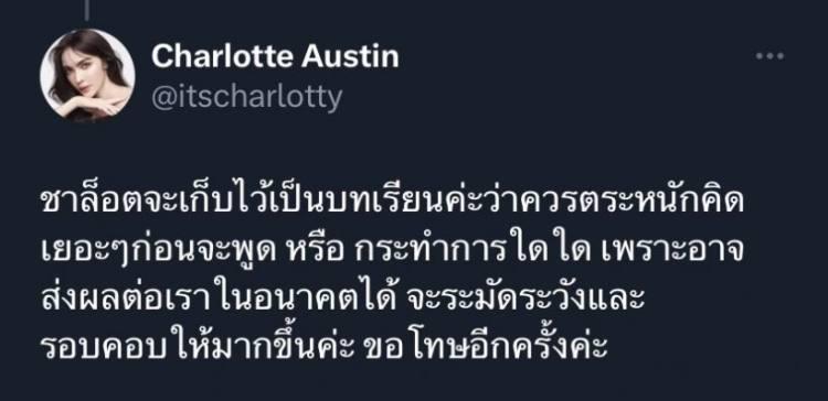 “ชาล็อตจะเก็บไว้เป็นบทเรียนค่ะว่าควรตระหนักคิดเยอะๆ ก่อนจะพูด หรือ กระทำการใดใด เพราะอาจส่งผลต่อเราในอนาคตได้ จะระมัดระวังและรอบคอบให้มากขึ้นค่ะ ขอโทษอีกครั้งค่ะ”