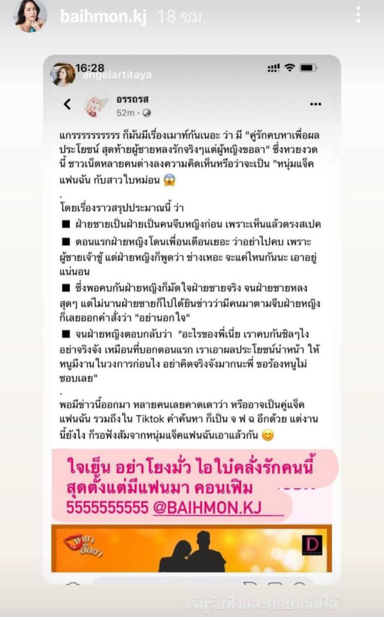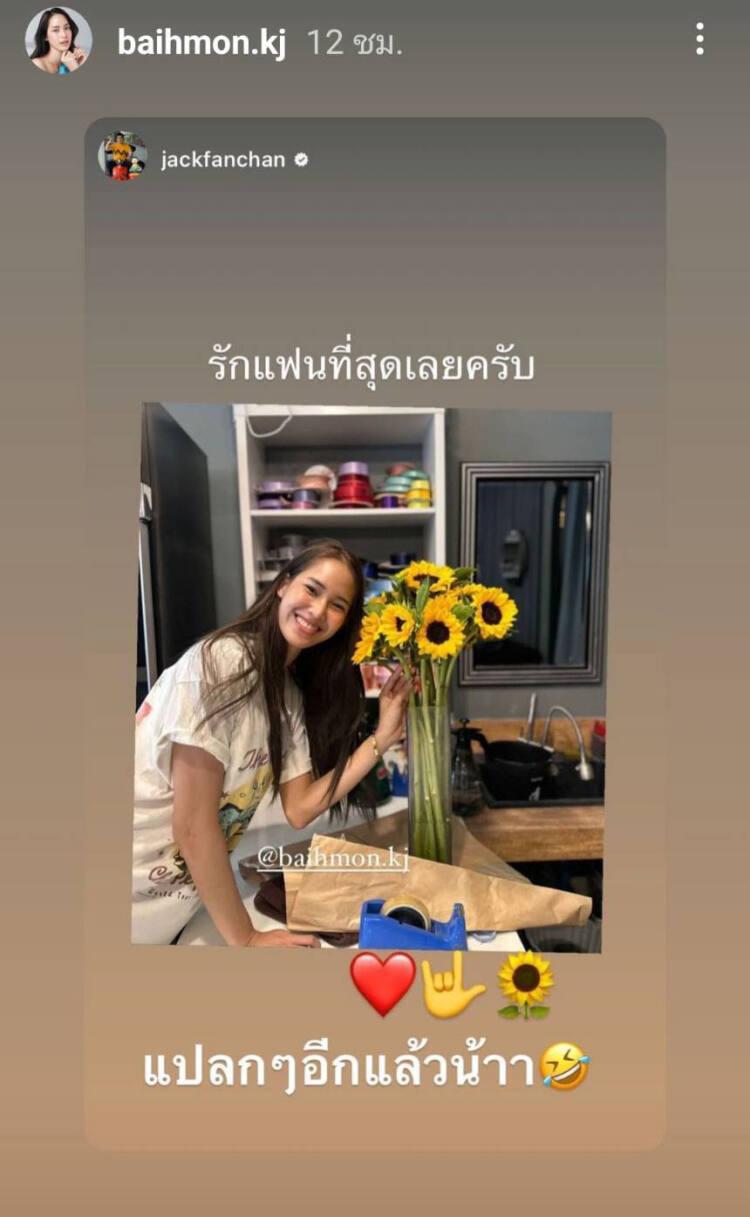 ส่วนทางด้านของแจ็ค แฟนฉัน ได้โพสต์รูปภาพของใบหม่อนลงในไอจีสตอรี่ และระบุข้อความหวาน “รักแฟนที่สุดเลยครับ” รวมทั้งแชร์สตอรี่ของเพื่อนที่ระบุว่าข่าวนี้ไม่น่าใช่ แต่ถ้าข่าวบอกว่า จ ฟ ฉ แอบแฟนไปเที่ยวพอมีมูล!