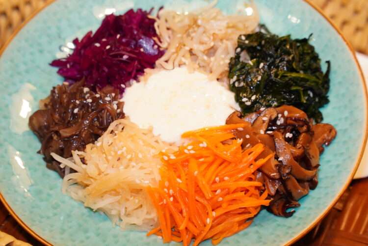 5. ข้าวยำเกาหลี (bibimbap) จากเมนูดังสัญชาติเกาหลี รังสรรค์ซอสเจที่ทำจากเต้าหู้และซอสเห็ดหอม ให้มีรสชาติที่ลงตัวสไตล์เกาหลี พร้อมเลือกใช้ผักหลายชนิด นำมา ผัด,หมัก,ดอง เพื่อให้ได้หลากหลายรสชาติและเนื้อสัมผัสที่หลากหลาย