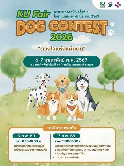 ขอเชิญผู้รักสุนัขและเจ้าของน้องหมาทุกสายพันธุ์ ร่วมสร้างสีสันและความประทับใจไปกับ การประกวดแฟนซีสุนัข KU Fair Dog Contest 2026 ภายใต้แนวคิด “ดวงใจแห่งแผ่นดิน” เพื่อถวายเกียรติ พระพันปีหลวง และแสดงความจงรักภักดี 🙏🏻