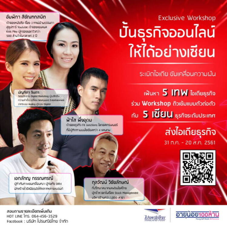 บริษัท ไปรษณีย์ไทย จำกัด (ปณท) พร้อมเคียงคู่ผู้ลงมือทำ หนุนผู้ประกอบการให้เป็นดาวเด่นในแวดวงธุรกิจ คว้าตัวสุดยอด 5 กูรู มากประสบการณ์ออนไลน์มาถ่ายทอดวิชาขั้นเทพ นับเป็นครั้งแรกที่คุณจะได้เข้าร่วม Exclusive Workshop เพื่อความเป็นยอดนักลงทุน และอัปพลังติดอาวุธให้พร้อมสู้ทุกสนามการตลาดแบบอยู่หมัด