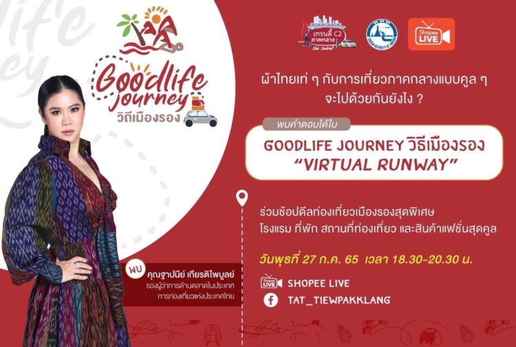กับกิจกรรม ‘GOODLIFE JOURNEY วิถีเมืองรอง’ VIRTUAL RUNWAY นำเสนอผ้าไทยจากเมืองรองภาคกลางที่นำไปสู่การเดินทางท่องเที่ยวไปสัมผัสประสบการณ์ที่น่าประทับใจ ในเส้นทางราชบุรี-สมุทรสงคราม , สุพรรณบุรี-อ่างทอง และ ลพบุรี-สิงห์บุรี-อ่างทอง พร้อมกิจกรรม Online Event Marketing เสนอดีลพิเศษสินค้าแฟชั่น , ชุดจากผ้าไทย , กระเป๋า ,เครื่องประดับ และบริการทางการท่องเที่ยว ที่พัก ร้านอาหาร แหล่งท่องเที่ยว ฯลฯ