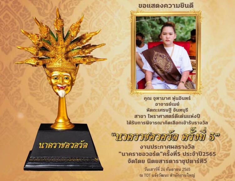 และบุคคล องค์กร ที่ผ่านการคัดเลือก ให้เข้ารับรางวัล นาคราชอวอร์ด ครั้งที่ 5 ประจำปี 2565 ในสาขา โหราศาสตร์ดีเด่นแห่งปี คือ อาจารย์สักลายมือชื่อดัง ที่สร้างความปัง และความเฮง ให้กับเหล่าบรรดาลูกศิษย์มามากมาย อย่าง อาจารย์เมย์ หัตถะเศรษฐี จันทบุรี หรือ คุณจุฑามาศ หุ่นอินทร์ ที่นอกจากจะมาเข้ารับรางวัลแล้วนั้น ยังร่วมเป็นประธานในการมอบรางวัลให้กับศิลปินดารา คนดัง อีกด้วย