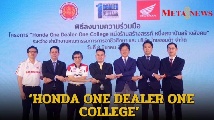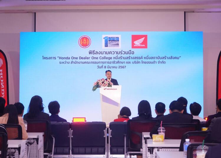 ไทยฮอนด้า ผู้ผลิตและจัดจำหน่ายรถจักรยานยนต์ และเครื่องยนต์อเนกประสงค์ฮอนด้าในประเทศไทย ร่วมมือกับ สํานักงานคณะกรรมการการอาชีวศึกษา (สอศ.) และร้านผู้จำหน่ายรถจักรยานยนต์ฮอนด้า ลงนามความร่วมมือในโครงการ ‘หนึ่งร้านสร้างสรรค์ หนึ่งสถาบันสร้างสังคม (One Dealer One College)’ เพื่อขับเคลื่อนการผลิตและพัฒนาบุคลากรอาชีวศึกษาที่มีคุณภาพ ให้สอดคล้องกับความต้องการของภาคอุตสาหกรรมยานยนต์ในปัจจุบัน พร้อมทั้งส่งเสริมและพัฒนาศักยภาพครู และบุคลากรทางการศึกษา ด้วยความรู้ ทักษะด้านยานยนต์และเครื่องยนต์อเนกประสงค์จากทางฮอนด้า เพื่อให้ทันต่อการเปลี่ยนแปลงของเทคโนโลยี และเป็นกำลังสำคัญในการส่งต่อความรู้ ทักษะ และวิชาการ ให้แก่สถานอาชีวะศึกษาทั่วประเทศไทย