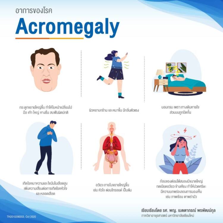 “โรคนี้มีอาการที่หลากหลาย ผู้ป่วยบางคนอาจจะมาด้วยอาการปวดศีรษะหรือมองเห็นผิดปกติ บางคนถึงขั้นเป็นโรคเบาหวาน ภาวะหยุดหายใจขณะนอนหลับ หัวใจโตเหนื่อยง่าย บางคนอาจมาเพราะเกิดจากมีคนทักรูปร่างหน้าตาที่เปลี่ยนไป ทั้งนี้แพทย์จะประเมินอาการแสดงที่เข้าได้กับโรคนี้ (ซึ่งสามารถดูได้จากภาพ) และการตรวจยืนยันว่ามีฮอร์โมนเจริญเติบโตสูงเกินระดับปกติหรือไม่ ร่วมกับการตรวจภาพถ่ายทางรังสีเพื่อประเมินก้อนเนื้องอกของต่อมใต้สมอง”