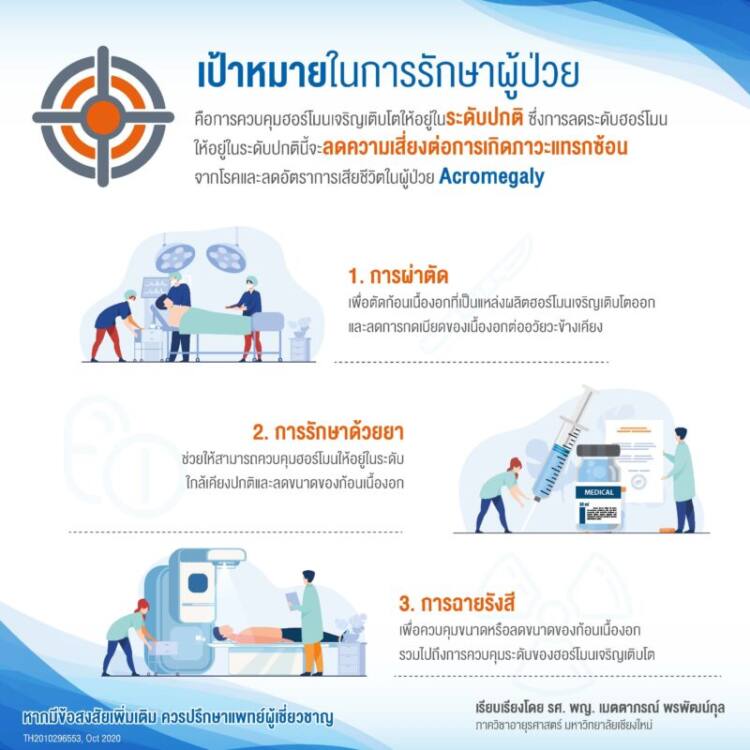 การรักษาจะมีเป้าหมายเพื่อควบคุมระดับฮอร์โมนเจริญเติบโตในเลือดให้ใกล้เคียงระดับปกติมากที่สุดและการลดขนาดของก้อนเนื้องอก แนวทางการรักษาแพทย์จะทำการผ่าตัดเอาก้อนเนื้องอกออกเป็นลำดับแรกถ้าหากไม่มีข้อห้ามของการผ่าตัด เนื่องจากการผ่าตัดเป็นวิธีที่ดีที่สุดที่จะให้ผู้ป่วยมีโอกาสหายขาดได้ แต่สำหรับผู้ป่วยบางรายที่เนื้องอกมีขนาดใหญ่หรือลุกลามมากซึ่งไม่สามารถผ่าตัดออกให้หมดได้ หรือในผู้ป่วยที่ไม่หายขาดหลังการผ่าตัด แพทย์อาจพิจารณาการรักษาด้วยการฉายแสง หรือการใช้ยาเพื่อลดและควบคุมระดับฮอร์โมน หรืออาจใช้ทั้งการฉายแสงควบคู่ไปกับการให้ยา