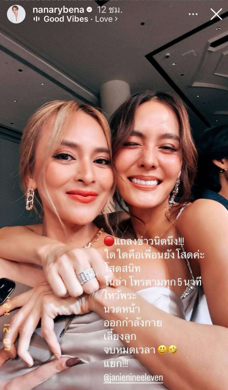 “แถลงข่าวนิดนึง!!! ใดใดคือเพื่อนยังโสดค่ะ โสดสนิท โนล่าโทรตามทุก 5 นาที ไหว้พระ นวดหน้า ออกกำลังกาย เลี้ยงลูก จบหมดเวลา แยก!!!”