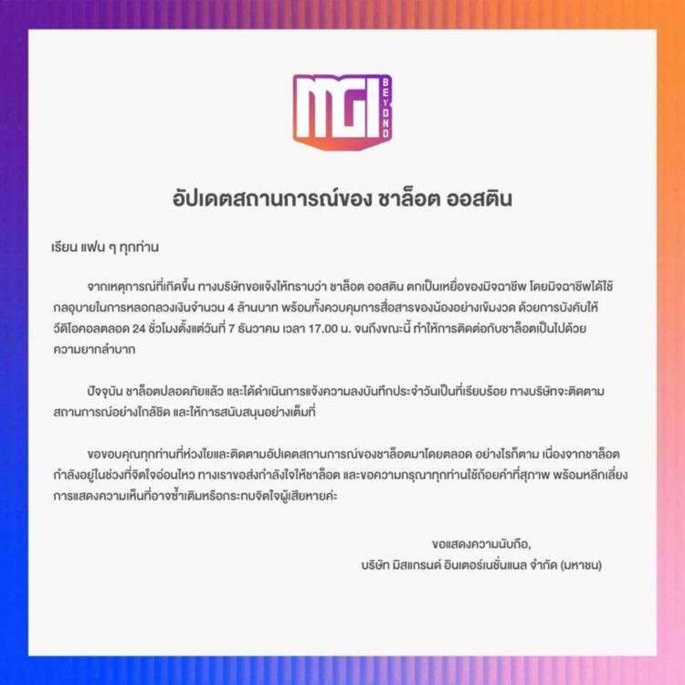 “เรียน แฟน ๆ ทุกท่าน จากเหตุการณ์ที่เกิดขึ้น ทางบริษัทขอแจ้งให้ทราบว่า ชาล็อต ออสติน ตกเป็นเหยื่อของมิจฉาชีพ โดยมิจฉาชีพได้ใช้กลอุบายในการหลอกลวงเงินจำนวน 4 ล้านบาท พร้อมทั้งควบคุมการสื่อสารของน้องอย่างเข้มงวด ด้วยการบังคับให้วิดีโอคอลตลอด 24 ชั่วโมง ตั้งแต่วันที่ 7 ธันวาคม เวลา 17:00 น. จนถึงขณะนี้ ทำให้การติดต่อกับชาล็อตเป็นไปด้วยความยากลำบาก