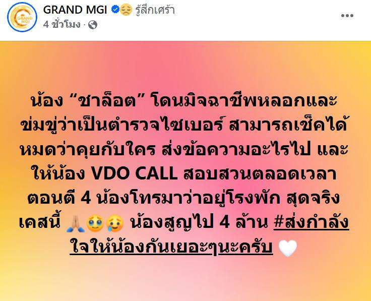 แฟนๆ ส่งกำลังใจให้ “ชาล็อต ออสติน” หลังทางเพจ GRAND MGI ต้นสังกัดมิสแกรนด์ ได้แจ้งข่าวว่าชาล็อตตกเป็นเหยื่อมิจฉาชีพ ข่มขู่ว่าเป็นตำรวจไซเบอร์ ทำให้สูญเงิน 4 ล้าน และยังถูกควบคุมบังคับให้วิดีโอคอล 24 ชั่วโมง ล่าสุด ทางต้นสังกัด มิสแกรนด์ ได้โพสต์อัพเดตสถานการณ์ ตอนนี้ ชาล็อต ปลอดภัยแล้ว