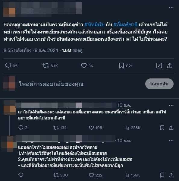 1.ทำIVF และวิธีอื่นๆ ในไทยยังต้องใช้ทะเบียนสมรส 2.คุณนัทอาจจะไปทำที่ต่างประเทศ เลยไม่ต้องใช้ทะเบียนสมรส , เคยทำ ต้องใช้ใบทะเบียนสมรส แต่ทำนานแล้ว เมื่อ 7 – 8 ปีก่อน”