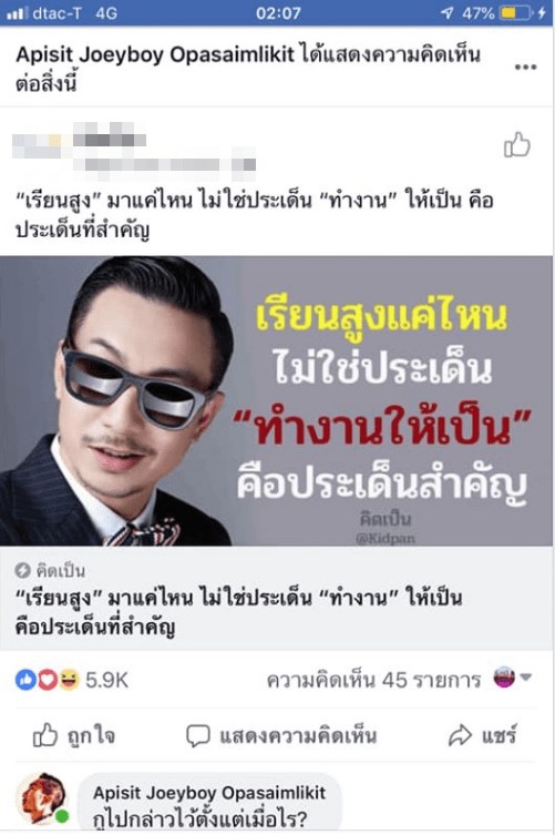ฮาลั่นทั้งโซเชียล! เมื่อ เพจคำคม แห่งหนึ่ง ได้นำภาพของ โจอี้ บอย แร็พเปอร์ชื่อดังของเมืองไทย พร้อมกับเขียนข้อความในภาพว่า “เรียนสูง มาแค่ไหน ไม่ใช่ประเด็น ทำงานให้เป็น คือ ประเด็นสำคัญ”