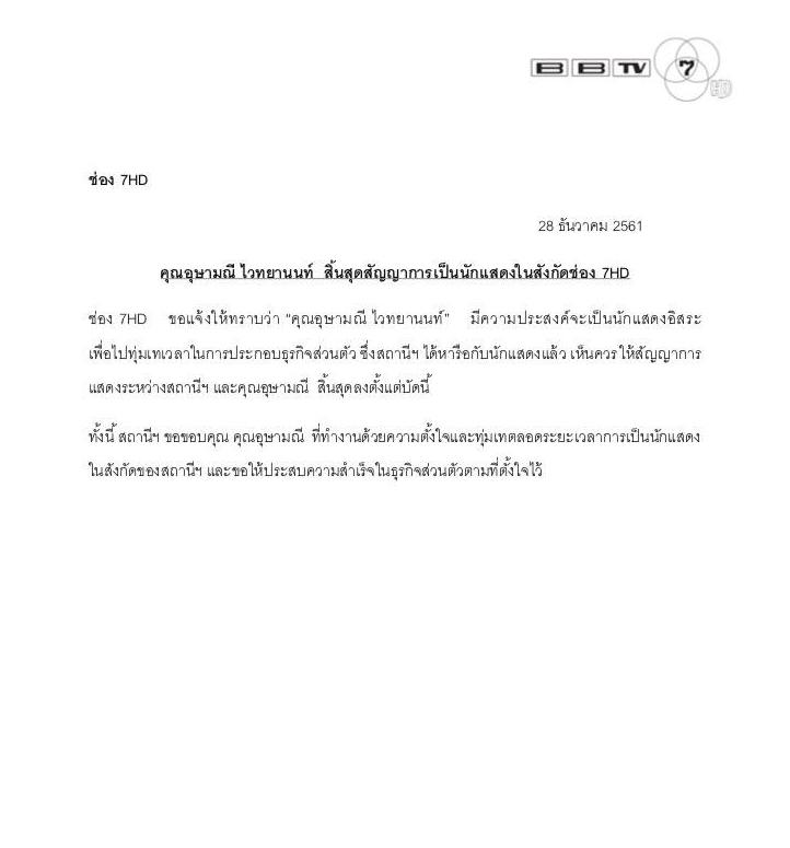 ช่อง 7HD ขอแจ้งให้ทราบว่า “คุณอุษามณี ไวทยานนท์” มีความประสงค์จะเป็นนักแสดงอิสระ เพื่อไปทุ่มเทเวลาในการประกอบธุรกิจส่วนตัว ซึ่งสถานีฯ ได้หารือกับนักแสดงแล้ว เห็นควรให้สัญญาการแสดงระหว่างสถานีฯ และคุณอุษามณี สิ้นสุดลงตั้งแต่บัดนี้ ทั้งนี้ สถานีฯ ขอขอบคุณ คุณอุษามณี ที่ทางานด้วยความตั้งใจและทุ่มเทตลอดระยะเวลาการเป็นนักแสดงในสังกัดของสถานีฯ และขอให้ประสบความสาเร็จในธุรกิจส่วนตัวตามที่ตั้งใจไว้”