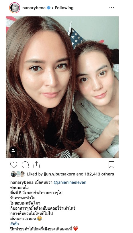 “เบื่อคนขวา @janienineeleven ชอบนอนไว ตื่นตี 5 วิ่งออกกำลังกายยาวๆไป รักความหน้าใส ไม่ชอบเมคอัพใดๆ กินอาหารทุกมื้อต้องนับแคลอรี่ว่าเท่าไหร่ กลางคืนชวนไปไหนก็ไม่ไป มันบอกง่วงนอน #เฮ้อ ปีหน้าขอทำได้สักครึ่งนึงของเพื่อนคนนี้”