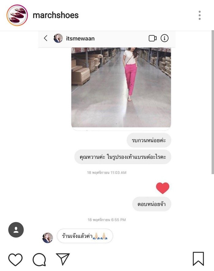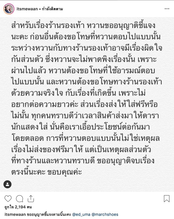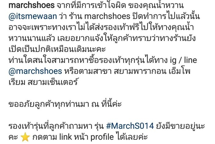 โดยทางร้านได้ลงข้อความชี้แจงแบบแซ่บ ๆ ว่า “จากที่มีการเข้าใจผิด ของคุณน้ำหวาน @itsmewaan ว่า ร้าน marchshoes ปิดทำการไปแล้วนั้น อาจจะเพราะทางเราไม่ได้ส่งรองเท้าฟรีไปให้ทางคุณน้ำหวานนานแล้ว เลยอยากแจ้งให้ลูกค้าทราบว่าทางร้านยังเปิดเป็นปกติเหมือนเดิมนะคะ..”