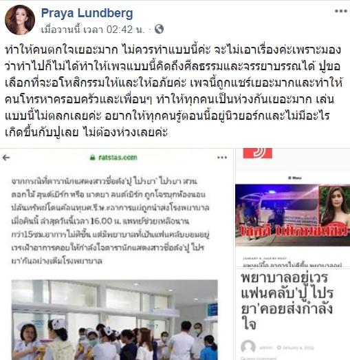 เพื่อให้ทุกคนที่รู้จักและครอบครัวของเธอสบายใจไม่ต้องเป็นกังวลใดๆ ล่าสุด ในเฟซบุ๊ค Praya Lundberg ได้โพสต์ข้อความโดยบอกว่าเธอสบายดี พร้อมกับตำหนิเพจไร้สาระดังกล่าวว่าเป็นการกระทำที่แย่มาก แต่เธอจะไม่เอาเรื่องใดๆ ขออโหสิกรรมให้
