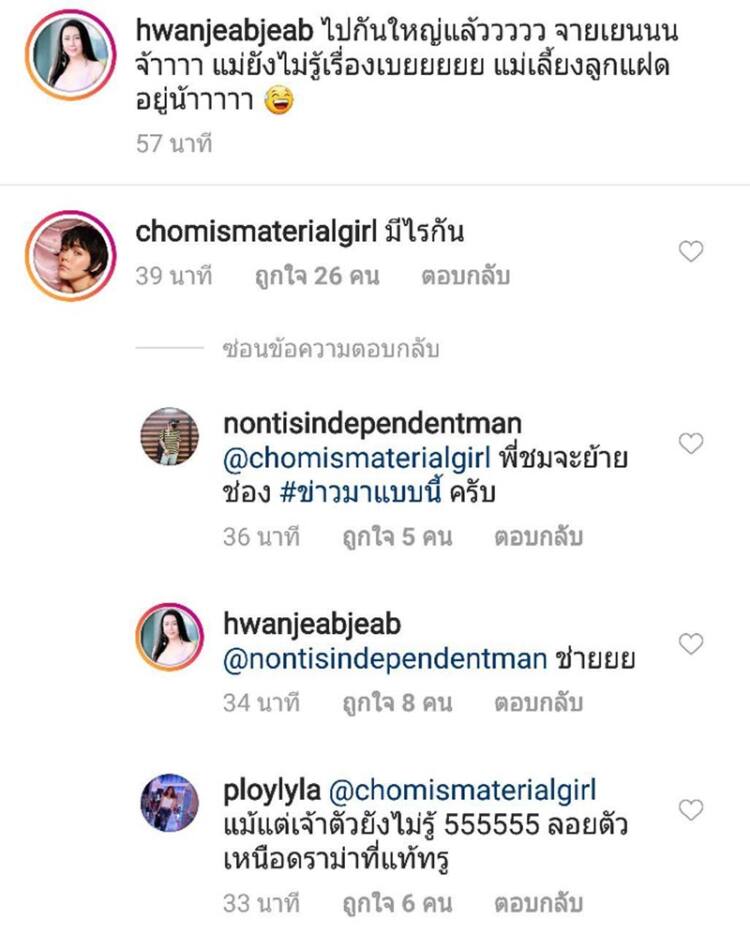 ทาง สาวชมพู่ ก็ได้เข้ามาคอมเมนต์สอบถามในโพสต์นี้ด้วยว่า “มีไรกัน” ซึ่งก็เป็นที่แน่ชัดเลยว่าซุปตาร์สาวยังไม่ทราบเรื่องนี้ งานนี้ยังมีแฟน ๆ บอกอีกว่า สมกับเป็นเจ้าของวลีลอยตัวเหนือดราม่าจริง ๆ เพราะเจ้าตัวเองก็ยังไม่ทราบข่าว และยังบอกอีกว่าแม้จะย้ายช่องไปอยู่ที่ไหน ก็ยังคงรักและจะติดตามผลงานของ สาวชมพู่ ต่อไปแน่นอน โดย พี่หวานเจี๊ยบ ก็ยังได้ตอบคอมเมนต์คุยกับเพื่อนด้วยว่า กลัวทางช่องจะเข้าใจผิดเลยต้องรีบออกมาชี้แจงแบบนี้
