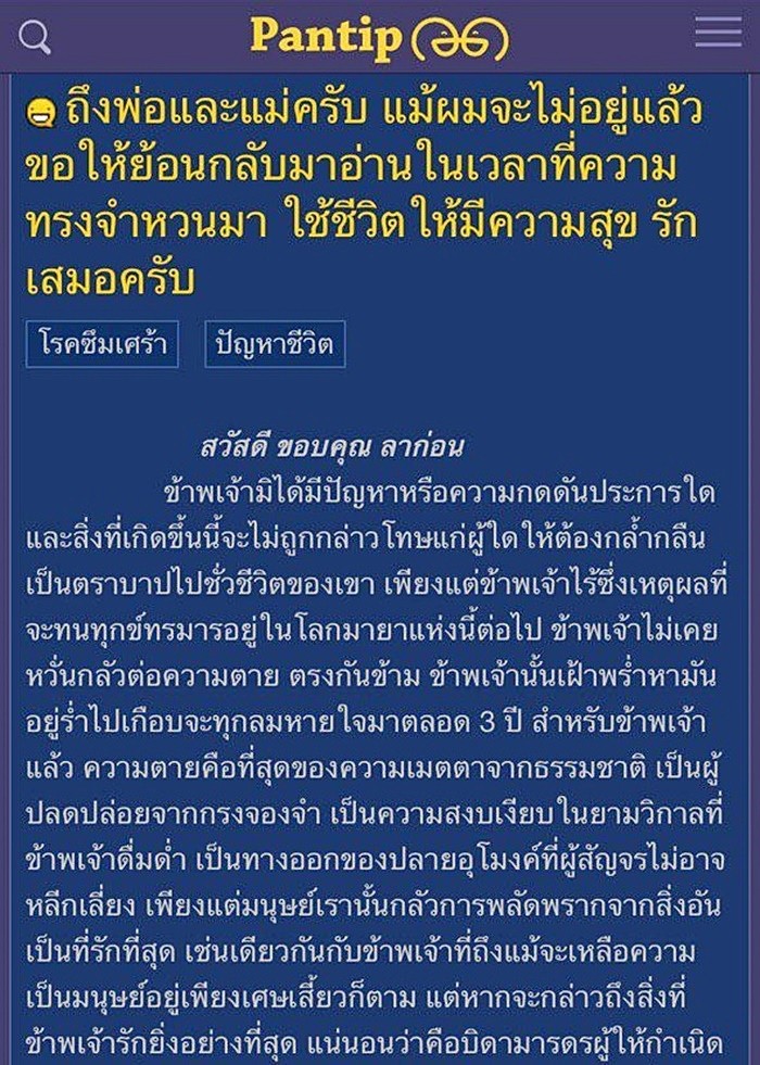 ความคืบหน้ากรณีโลกออนไลน์มีการแชร์ข้อความขอความช่วยเหลือ เด็กหนุ่มเขียนกระทู้พันทิปสั่งลาครอบครัวจากอาการป่วยโรคซึมเศร้า “ถึงพ่อและแม่ครับ แม้ผมจะไม่อยู่แล้ว ขอให้ย้อนกลับมาอ่านในเวลาที่ความทรงจำหวนมา ใช้ชีวิตให้มีความสุข รักเสมอครับ” ซึ่งในเวลาต่อมามีรายงานว่าคือหลานชายของ ตั๊ก นภัสรัญชน์ แฟนหนุ่มของดาราสาว ป๊อก ปิยธิดา