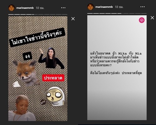เรียกว่างงในงงกันเลยกับข่าวที่เขียนขึ้น และประหลาดมากว่าไปเขียนข่าวนี้ได้อย่างไร ซึ่งมารีน่าได้แคปภาพและเขียนในไอจีสตอรี่ว่า เป็นข่าวที่รู้สึกว่าประหลาดที่สุดเท่าที่เคยเจอมา รวมถึงข้อความที่เป็นห่วงความรู้สึกหลาน ทั้ง น้องมีก้า และ น้องมีญ่า ที่เพิ่งลืมตาดูโลกได้ไม่กี่วันว่าโตมาเจอข่าวนี้จะรู้สึกอย่างไรด้วย