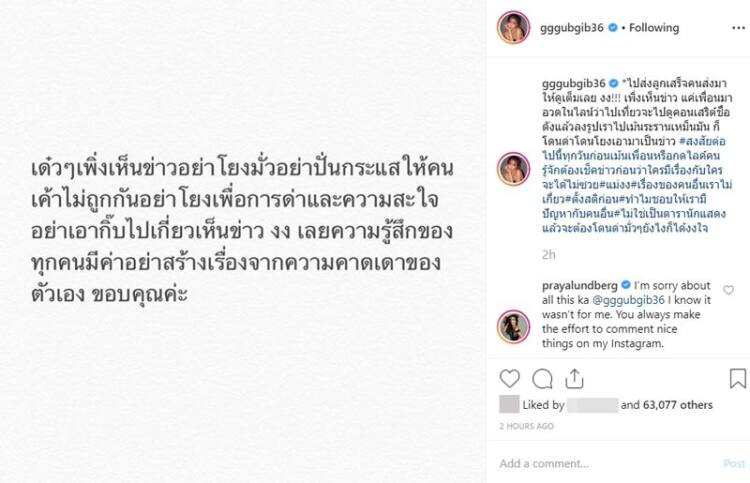 ทั้งนี้ ปู ไปรยา ได้เข้ามาคอมเมนต์ขอโทษกุ๊บกิ๊บด้วย ที่โดนโยงกับเรื่องนี้ โดยบอกว่า “I’m sorry about all this ka @gggubgib36 I know it wasn’t for me. You always make the effort to comment nice things on my Instagram.”