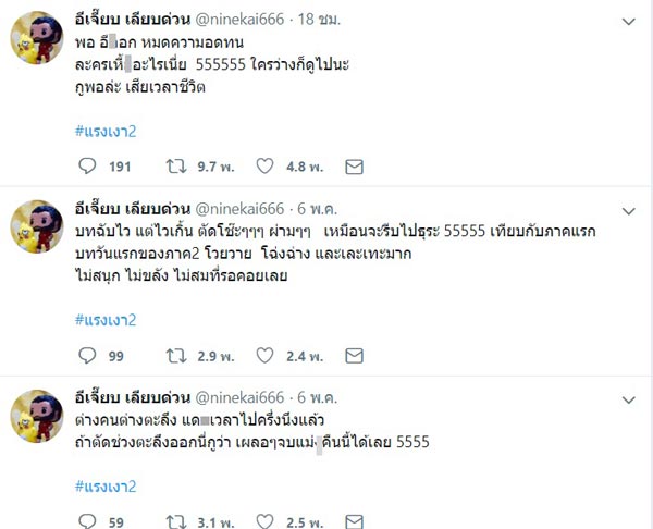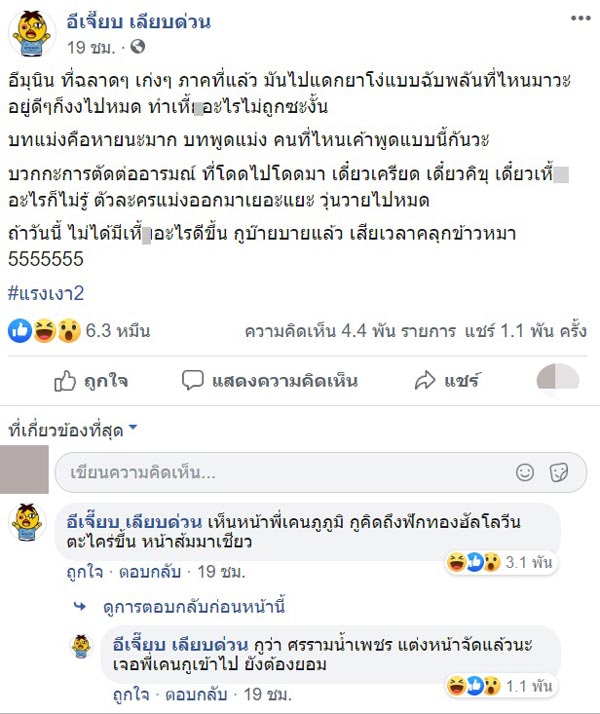 งานนี้ก็ทำเอาผู้ชมหลายคนถูกอกถูกใจ เข้ามาร่วมคอมเมนต์ถึงละคร แรงเงา 2 กันเพียบ โดยก่อนหน้านี้ อีเจี๊ยบ เคยโพสต์ถึงละครเรื่องนี้ในทวิตเตอร์ บอกว่า “บทฉับไว แต่ไวเกิ๊น ตัดโช้ะ ๆๆๆ ผ่าม ๆๆ เหมือนจะรีบไปธุระ 55555 เทียบกับภาคแรก บทวันแรกของภาค 2 โวยวาย โฉ่งฉ่าง และเละเทะมาก ไม่สนุก ไม่ขลัง ไม่สมที่รอคอยเลย #แรงเงา2” และหลังจากดูละครตอนที่ 2 อีเจี๊ยบ ก็โพสต์อีกครั้ง ประกาศว่า “พอ อี-อก หมดความอดทน ละครเหี้-อะไรเนี่ย 555555 ใครว่างก็ดูไปนะ กูพอละ เสียเวลาชีวิต #แรงเงา2”