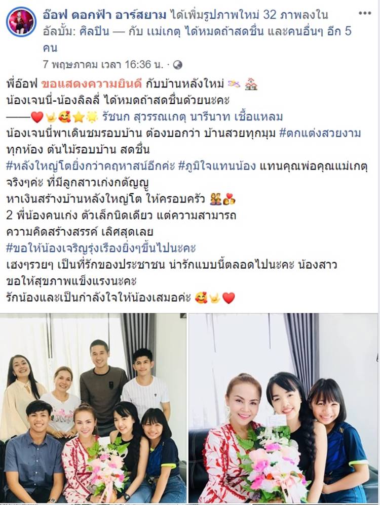 “พี่อ๊อฟ ขอแสดงความยินดี กับบ้านหลังใหม่ น้องเจนนี่-น้องลิลลี่ ได้หมดถ้าสดชื่นด้วยนะคะ รัชนก สุวรรณเกตุ นารีนาท เชื้อแหลม น้องเจนนี่พาเดินชมรอบบ้าน ต้องบอกว่า บ้านสวยทุกมุม #ตกแต่งสวยงาม ทุกห้อง ต้นไม้รอบบ้าน สดชื่น #หลังใหญ่โตยิ่งกว่าคฤหาสน์อีกค่ะ #ภูมิใจแทนน้อง แทนคุณพ่อคุณแม่เกตุ จริง ๆ ค่ะ ที่มีลูกสาวเก่งกตัญญู หาเงินสร้างบ้านหลังใหญ่โต ให้ครอบครัว 2 พี่น้องคนเก่ง ตัวเล็กนิดเดียว แต่ความสามารถ ความคิดสร้างสรรค์ เลิศสุดเลย #ขอให้น้องเจริญรุ่งเรืองยิ่งๆขึ้นไปนะคะ เฮง ๆ รวย ๆ เป็นที่รักของประชาชน น่ารักแบบนี้ตลอดไปนะคะ น้องสาว ขอให้สุขภาพแข็งแรงนะคะ รักน้องและเป็นกำลังใจให้น้องเสมอค่ะ”