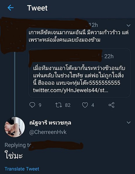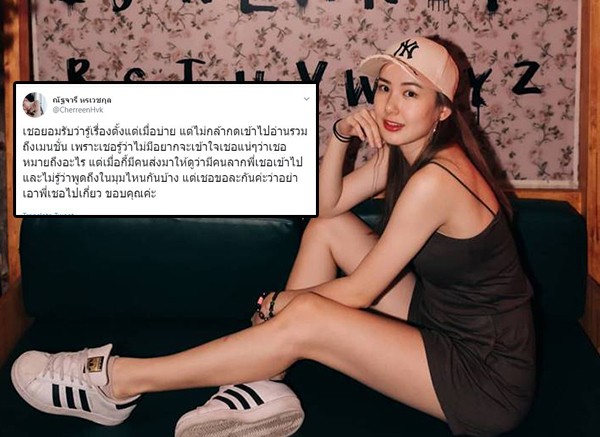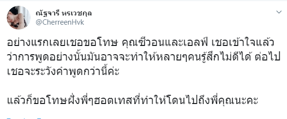 ซึ่งภายหลังข้อความเผยแพร่ออกไป โลกออนไลน์ก็เดือดพล่าน มองว่าการกระทำของสาวเชอรีนไม่เหมาะสม สิ้นคิด แม้เจ้าของทวิตต้นเรื่องได้ออกมาโพสต์ขอโทษไปแล้ว แต่สาวเชอรีนก็ยังโดนถล่มอยู่ จนต้องออกมาขอโทษหนุ่มซีวอน ก่อนจะขอร้องว่าอย่าลากพี่ชายมาเอี่ยวด้วยเลย เพราะไม่เกี่ยวกับเรื่องนี้ ต่อไปจะระวังคำพูดให้ดีกว่านี้