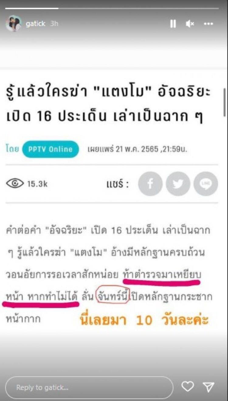 หลังจากที่ก่อนหน้านี้ “แซน วิศาพัช มโนมัยรัตน์” ออกมาโพสต์ฟาด “อัจฉริยะ เรืองรัตนพงศ์” เรื่องคำพูดที่เปลี่ยนไปเปลี่ยนมา แต่ก็ทิ้งคำถามเอาไว้กลางทาง ไม่ยอมตอบให้กระจ่างสักข้อ ล่าสุดวันนี้ “กระติก อิจศรินทร์ จุฑาสุขสวัสดิ์” ก็รับไม้ต่อจากแซน ฟาดต่ออัจฉริยะ ย้อนคำพูดที่อีกฝ่ายเคยให้สัมภาษณ์เมื่อวันที่ 21 พ.ค. ระบุว่ารู้แล้วว่าใครเป็นคนฆ่าแตงโม พร้อมขีดเส้นใต้สีแดงๆ ประโยคที่ว่า “ท้าตร.เหยียบหน้าหากทำไม่ได้ ลั่นจันทร์นี้เปิดหลักฐานกระชากหน้ากาก” โดยกระติกได้โพสต์สตอรี่ ถามสั้นๆ ว่า “นี่เลยมา 10 วันละค่ะ” เรียกว่าพร้อมชน ไม่กลัว สู้ไม่ถอยเลยทีเดียว