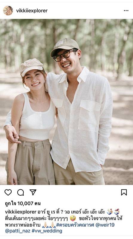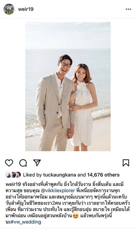 “จริงอย่างที่เขาพูดกัน ยิ่งใกล้วันงานยิ่งตื่นเต้น และมีความสุข ขอบคุณ @vikkiiexplorer ที่เหนื่อยจัดการงานทุกอย่างให้ออกมาพร้อม และสมบูรณ์แบบมากๆ พรุ่งนี้แล้วนะครับ วันสำคัญในชีวิตของเรา 2 คน เราคุยกันว่า เราอยากให้ครอบครัว เพื่อน ที่มาร่วมงาน ประทับใจ และรู้สึกอบอุ่น สบายใจ เหมือนได้มาพักผ่อน เหมือนอยู่สวนหลังบ้าน แล้วพบกันพรุ่งนี้นะ #vw_wedding”