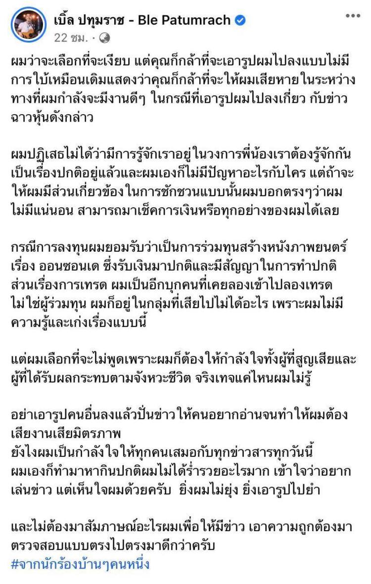 “ผมว่าจะเลือกที่จะเงียบ แต่คุณก็กล้าที่จะเอารูปผมไปลงแบบไม่มีการใบ้เหมือนเดิมแสดงว่าคุณก็กล้าที่จะให้ผมเสียหายในระหว่างทางที่ผมกำลังจะมีงานดีๆ ในกรณีที่เอารูปผมไปลงเกี่ยว กับข่าวฉาวหุ้นดังกล่าว ผมปฏิเสธไม่ได้ว่ามีการรู้จักเราอยู่ในวงการพี่น้องเราต้องรู้จักกันเป็นเรื่องปกติอยู่แล้วและผมเองก็ไม่มีปัญหาอะไรกับไคร แต่ถ้าจะให้ผมมีส่วนเกี่ยวข้องในการชักชวนแบบนั้นผมบอกตรงๆว่าผมไม่มีแน่นอน สามารถมาเช็คการเงินหรือทุกอย่างของผมได้เลย กรณีการลงทุนผมยอมรับว่าเป็นการร่วมทุนสร้างหนังภาพยนตร์ เรื่อง ออนซอนเด ซึ่งรับเงินมาปกติและมีสัญญาในการทำปกติ ส่วนเรื่องการเทรด ผมเป็นอีกบุกคนที่เคยลองเข้าไปลองเทรดไม่ใช่ผู้ร่วมทุน ผมก็อยู่ในกลุ่มที่เสียไปไม่ได้อะไร เพราะผมไม่มีความรู้และเก่งเรื่องแบบนี้ แต่ผมเลือกที่จะไม่พูดเพราะผมก็ต้องให้กำลังใจทั้งผู้ที่สูญเสียและผู้ที่ได้รับผลกระทบตามจังหวะชีวิต จริงเทจแค่ไหนผมไม่รู้อย่าเอารูปคนอื่นลงแล้วปั่นข่าวให้คนอยากอ่านจนทำให้ผมต้องเสียงานเสียมิตรภาพ ยังไงผมเป็นกำลังใจให้ทุกคนเสมอกับทุกข่าวสารทุกวันนี้ ผมเองก็ทำมาหากินปกติผมไม่ได้ร่ำรวยอะไรมาก เข้าใจว่าอยากเล่นข่าว แต่เห็นใจผมด้วยครับ ยิ่งผมไม่ยุ่ง ยิ่งเอารูปไปยำ และไม่ต้องมาสัมภาษณ์อะไรผมเพื่อให้มีข่าว เอาความถูกต้องมาตรวจสอบแบบตรงไปตรงมาดีกว่าครับ #จากนักร้องบ้านๆคนหนึ่ง”