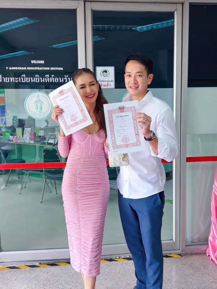 “คบกัน 14 ปี ครบรอบแต่งงาน 6 ปี ลูก 2 เพิ่งได้ฤกษ์จดทะเบียน มีสามีถูกต้องตามกฎหมาย ที่ผ่านมาทดลองอยู่แล้วขาดคนนี้ไม่ได้จริงๆ รักนะคะป๊า 9/9/2022”