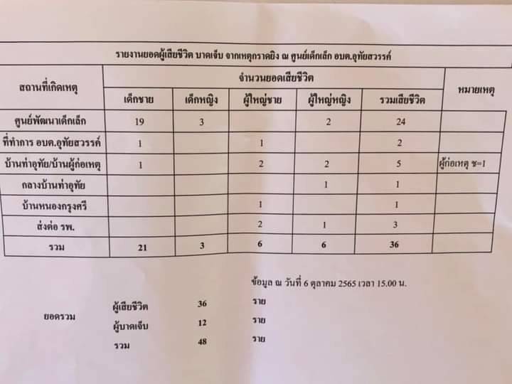 จากการสอบถาม มูลนิธิกู้ภัยในพื้นที่ มีผู้เสียชีวิต ล่าสุด 24 ราย และได้รับบาดเจ็บหลายราย ทั้งเด็กและผู้ใหญ่ ในช่วงเวลา 14.00น. เจ้าหน้าที่ตำรวจในจังหวัดหนองบัวลำภูได้เข้าปิดล้อมคนร้าย ลักษณะ ใช้รถกระบะวีโก้ 4ประตูสีขาว ทะเบียน กธ 6499 กทม. มีรอยเชียวชนด้านหน้า สถานที่ โรงเรียนสวาท ต. อุทัยสวรรค์ อ. นากลาง จ.หนองบัวลำภู เป็นที่เรียบร้อย