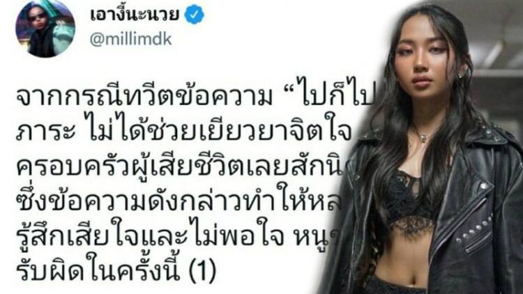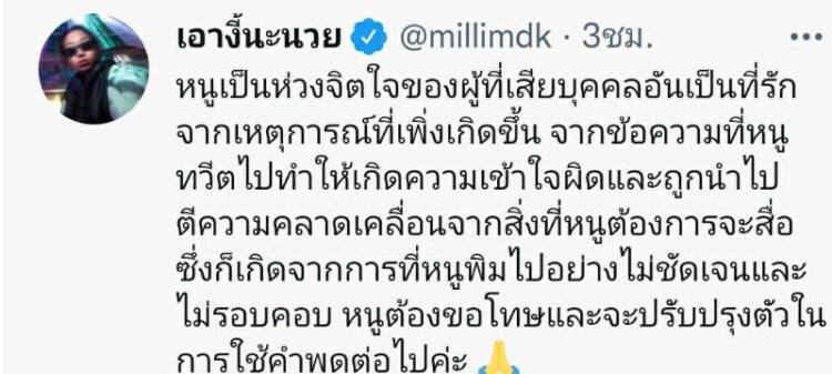 ล่าสุด มิลลิ ก็ได้ทวีตฯ ขอโทษกับเรื่องที่เกิดขึ้นแล้ว ลั่นเกิดจากอารมณ์และความไม่รอบคอบในการใช้คำพูด!