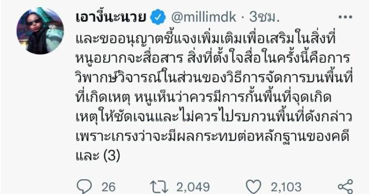 และขออนุญาตชี้แจงเพิ่มเติมเพื่อเสริมในสิ่งที่หนูอยากจะสื่อสาร สิ่งที่ตั้งใจสื่อในครั้งนี้คือการวิพากษ์วิจารณ์ในส่วนของวิธีการจัดการบนพื้นที่ที่เกิดเหตุ หนูเห็นว่าควรมีการกั้นพื้นที่จุดเกิดเหตุให้ชัดเจนและไม่ควรไปรบกวนพื้นที่ดังกล่าว เพราะเกรงว่าจะมีผลกระทบต่อหลักฐานของคดี และ