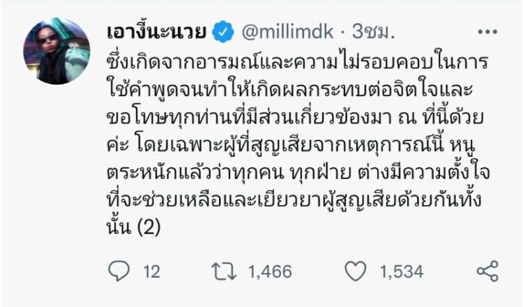 ซึ่งเกิดจากอารมณ์และความไม่รอบคอบในการใช้คำพูดจนทำให้เกิดผลกระทบต่อจิตใจและขอโทษทุกท่านที่มีส่วนเกี่ยวข้องมา ณ ที่นี้ด้วยค่ะ โดยเฉพาะผู้ที่สูญเสียจากเหตุการณ์นี้ หนูตระหนักแล้วว่าทุกคน ทุกฝ่าย ต่างมีความตั้งใจที่จะช่วยเหลือและเยียวยาผู้สูญเสียด้วยกันทั้งนั้น