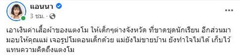 “เอาเงินค่าเสื้อผ้าของแตงโม ให้เด็กๆ ต่างจังหวัด ที่ขาดชุดนักเรียน อีกส่วนมามอบให้คุณแม่ เจอรูปโมตอนเด็กด้วย แม่ยังไม่ขายบ้าน ยังทำใจไม่ได้ เก็บไว้แทนความคิดถึงแตงโม”