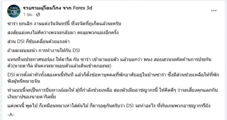“ซาร่า ยกเลิก งานแต่งวันจันทร์นี้ ที่จะจัดที่ภูเก็ตแล้วนะครับ สงสัยแม่-คงไม่คิดว่าเพจจะกลับมา ตะลุยพวกแม่-อีกครั้ง ส่วน DSI ก็ขับเคลื่อนด้วยแรงด่า ถ้าผมจะแนะนำ การทำงานให้กับ DSI แทนที่จะประกาศขอร้อง ให้ดาริล กับ ซาร่า เข้ามามอบตัว แล้วบอกว่า พนง สอบสวนจะคัดค้านการประกันตัว (นายดาริล มันคงจะมามอบตัวแล้วเดินเข้าคุกอะนะ)