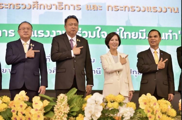 รมว.ศธ. กล่าวต่อไปว่า จากความร่วมมือ เมื่อวันที่ 19 มกราคม 2565 สู่การขับเคลื่อนภายใต้การบรูณาการการทำงานร่วมกันระหว่างกระทรวงศึกษาธิการและกระทรวงแรงงาน ภายใต้รัฐบาลที่นำโดย พลเอก ประยุทธ จันทร์โอชา นายกรัฐมนตรี เพื่อการส่งเสริมให้ประชาชนมีงานทำ สร้างแรงงานมีศักยภาพ มีงานทำ มีรายได้ มีหลักประกันมีความมั่นคงเป็นที่พึ่งของตนเองและผู้อื่น ซึ่งถือว่าเป็นภารกิจที่สามารถนำมาเสริมศักยภาพในการขับเคลื่อนการศึกษา และร่วมพัฒนาหลักสูตรฐานสมรรถนะ ในการจัดการเรียนรู้ตลอดชีวิต และการพัฒนาทักษะอาชีพของผู้เรียนได้เป็นอย่างดี อีกทั้ง ยังเป็นการพัฒนาศักยภาพของนักเรียน นักศึกษา รวมถึงแรงงานทุกระดับให้มีความรู้ ความสามารถ และทักษะฝีมือ ให้เป็นไปตามมาตรฐานฝีมือแรงงานแห่งชาติ และตรงกับความต้องการของตลาดแรงงาน ทั้งด้านปริมาณ และคุณภาพ รองรับการขยายตัวของเศรษฐกิจในอนาคต ตลอดจนพัฒนาสมรรถนะในการแข่งขันของประเทศ ให้ผู้จบการศึกษาในทุกระดับ และแรงงาน มีอาชีพ สู่คุณภาพชีวิตที่ดี