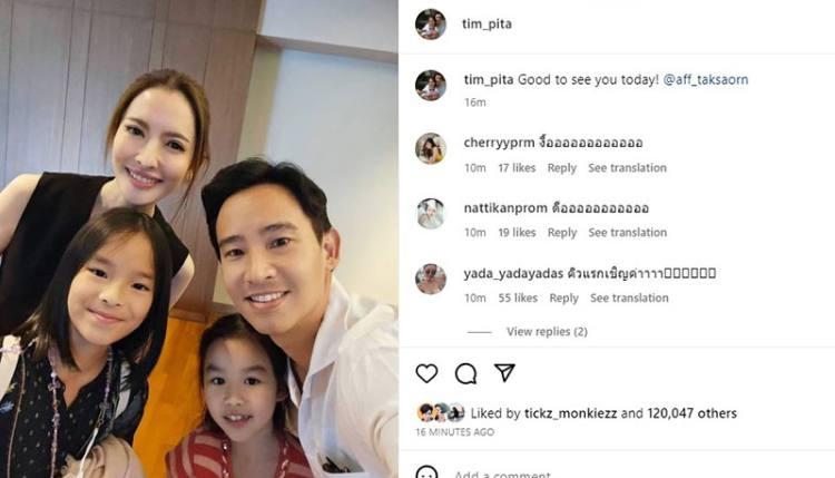 เป็นนางเอกสาวที่แรงเชียร์จากด้อมส้มเยอะมากๆ อยากให้เป็นสตรีหมายเลขหนึ่ง ของ “ทิม พิธา ลิ้มเจริญรัตน์” ว่าที่นายกฯ คนที่ 30 ล่าสุดด้อมส้มฟินขั้นสุด หลังจากที่ทิมได้มีโอกาสเจอ แอฟ ทักษอร และ น้องปีใหม่ โดยถ่ายภาพร่วมเฟรมกันพร้อมแคปชั่นว่า Good to see you today! @aff_taksaorn