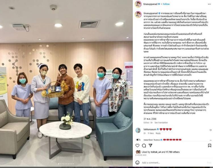 “จากระยะเวลา 1 เดือนครึ่งที่ผ่านมาในการดูแลรักษาจากบุคลากรทางการแพทย์และโรงพยาบาล ติ๊นาได้มีโอกาสมาเยี่ยมดูอาการน้องบิวอย่างใกล้ชิดและติดตามผลในทุกๆ วัน วันนี้มารับน้องบิวออกจาก รพ. แล้วค่ะ และติ๊นาขออนุญาตเป็นตัวแทนทางครอบครัวน้องบิว และคุณพ่อคุณแม่ มาอัปเดตอาการโดยรวมของน้องบิวให้ทุกๆ คนที่เป็นห่วงทราบโดยทั่วกันด้วยนะคะ ก่อนอื่นเลยต้องขอขอบคุณแทนน้องบิวและครอบครัวสำหรับคนที่สอบถามเข้ามาด้วยความเป็นห่วงนะคะ