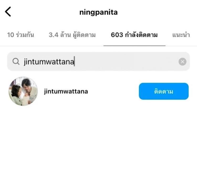 หลังจากที่มีข่าวถูกสามี “จิน จรินทร์” ท้าหย่า จนทำให้ต้องไปฟ้องร้องมือที่สาม ส่วนเรื่องข้อตกลงก่อนหย่าก็ยังไม่ลงตัว ทำให้ยังไม่ได้เซ็นหย่าจนถึงตอนนี้ ล่าสุดไม่รู้จะเป็นข่าวดีหรือไม่ หลังจากที่ “หนิง ปณิตา” กลับมาฟอลโลว์ไอจี สามี เหมือนเดิมแล้ว ทั้งที่ก่อนหน้านี้เจ้าตัวอันฟอลโลว์ไป รวมไปถึงแก๊งเพื่อนๆ อย่าง อั้ม พัชราภา ก็พลอยอันฟอลไอจีจินไปด้วยเช่นเดียวกัน ส่วนจะเป็นอย่างไรต่อไปต้องติดตามจ้า
