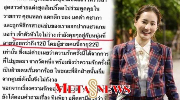 หลังจากที่ “ต่าย ชุติมา ทีปะนาภ” ออกรายการคุยแลก แดกดึก ของ “มดดำ คชาภา” และมีการพูดคุยเรื่องหัวใจ โดยระหว่างสัมภาษณ์ ต่ายก็เปิดรูปหนุ่มอายุ 22 ปีที่มาจีบให้มดดำดูจะจะ ทำเจ้าตัวอ้าปากค้างกลางรายการ โดยยืนยันว่าหล่อวัวตายควายล้มเลยทีเดียว