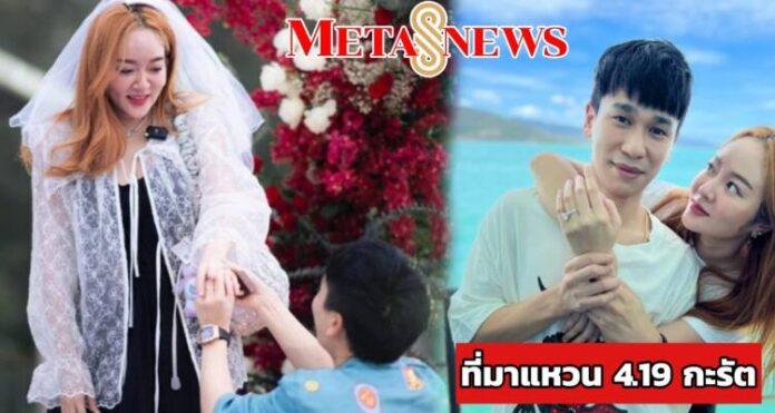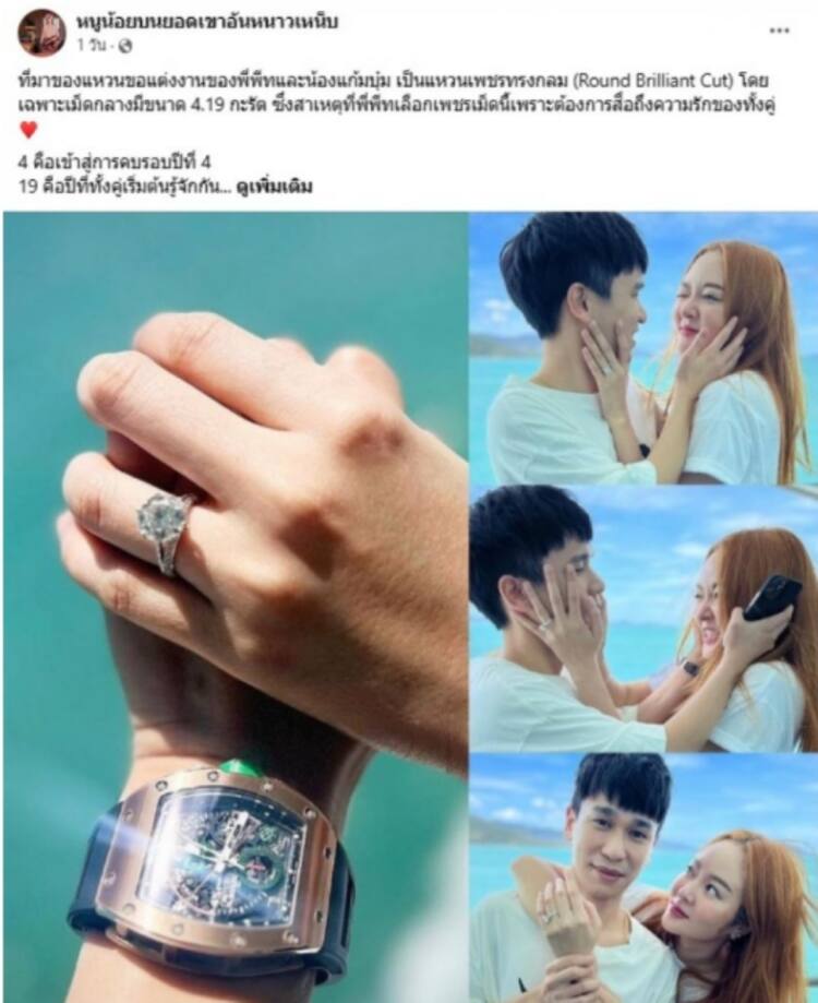 “ที่มาของแหวนขอแต่งงานของพี่พีทและน้องแก้มบุ๋ม เป็นแหวนทรงกลม (Round Brilliant Cut) โดยเฉพาะเม็ดกลางมีขนาด 4.19 กะรัต