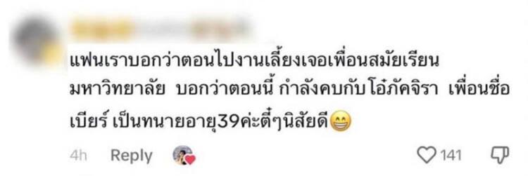 งานนี้นำไปสู่การจับตาของโลกออนไลน์ มีการสังเกตเห็นหนุ่มปริศนาอยู่ข้างๆ โอ๋รายหนึ่ง ซึ่งเห็นอยู่บ่อยๆ ทริปล่าสุดที่ไปกับแก๊งเพื่อน หนุ่มรายนี้ก็ไปด้วย ซึ่งดูจะตรงกับคำทำนายของหมอดูในรายการตีท้ายครัว โดยมีเม้นต์หนึ่งมาช่วยคอนเฟิร์มว่าฝ่ายชายคบหาดูใจกับโอ๋จริง ชื่อว่าเบียร์ มีอาชีพเป็นทนาย อายุ 39 ปี