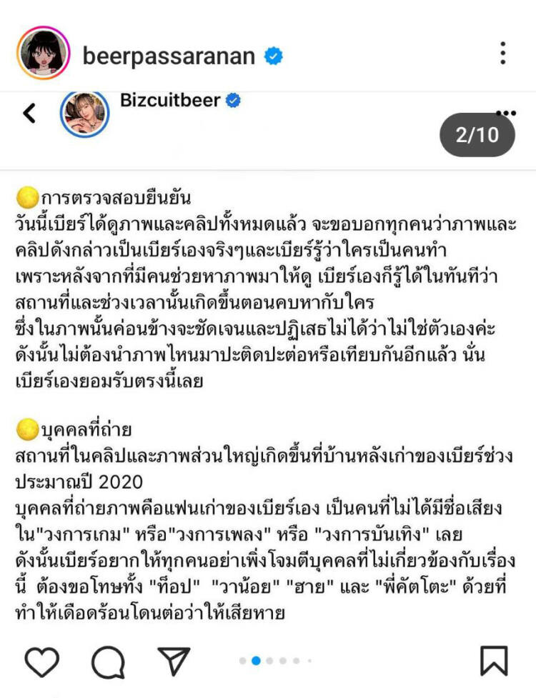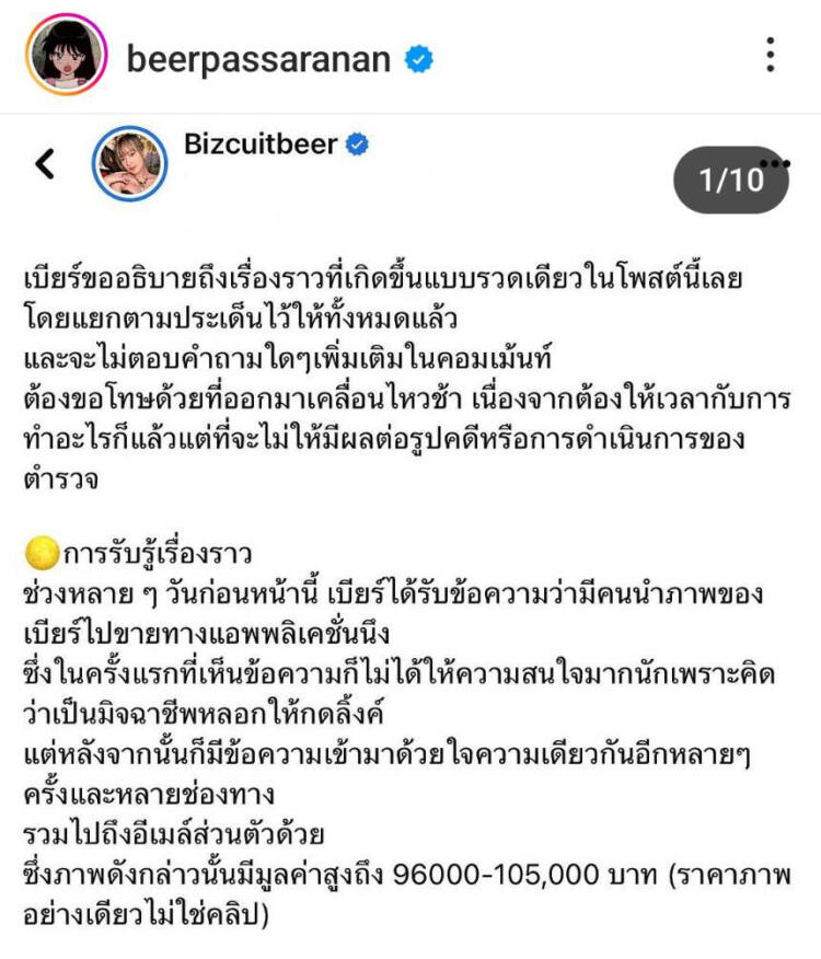 “เบียร์ขออธิบายถึงเรื่องราวที่เกิดขึ้นแบบรวดเดียวในโพสต์นี้โดยแยกตามประเด็นไว้ให้ทั้งหมดแล้ว และจะไม่ตอบคำถามใดๆ เพิ่มเติมในคอมเมนต์ ต้องขอโทษด้วยที่ออกมาเคลื่อนไหวช้า เนื่องจากต้องให้เวลากับการทำอะไรก็แล้วแต่ที่จะไม่ให้มีผลต่อรูปคดีหรือการดำเนินการของตำรวจ