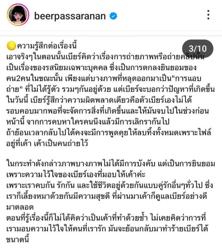 เอาจริงๆ ในตอนนั้นเบียร์คิดว่าเรื่องการถ่ายภาพหรือถ่ายคลิปนั้นเป็นเรื่องของรสนิยมเฉพาะบุคคล ซึ่งเป็นการตกลงยินยอมของคน 2 คนในขณะนั้น เพียงแต่บางภาพที่หลุดออกมาเป็น ‘การแอบถ่าย’ ที่ไม่ได้รู้ตัว รวมๆ กันอยู่ด้วย แต่เบียร์จะบอกว่าปัญหาที่เกิดขึ้นในวันนี้ เบียร์รู้สึกว่าความผิดพลาดเดียวคือตัวเบียร์เองไม่ได้รอบคอบมากพอที่จะจัดการสิ่งที่เกิดขึ้นและให้มันจบไปในช่วงก่อนหน้านี้ จากการคบหาใครคนนึงแล้วมีการเลิกรากันไป ถ้าย้อนเวลากลับไปได้คงจะมีการพูดคุยให้ลบทิ้งทั้งหมดเพราะไฟล์อยู่ที่เขา เขาเป็นคนถ่ายไว้