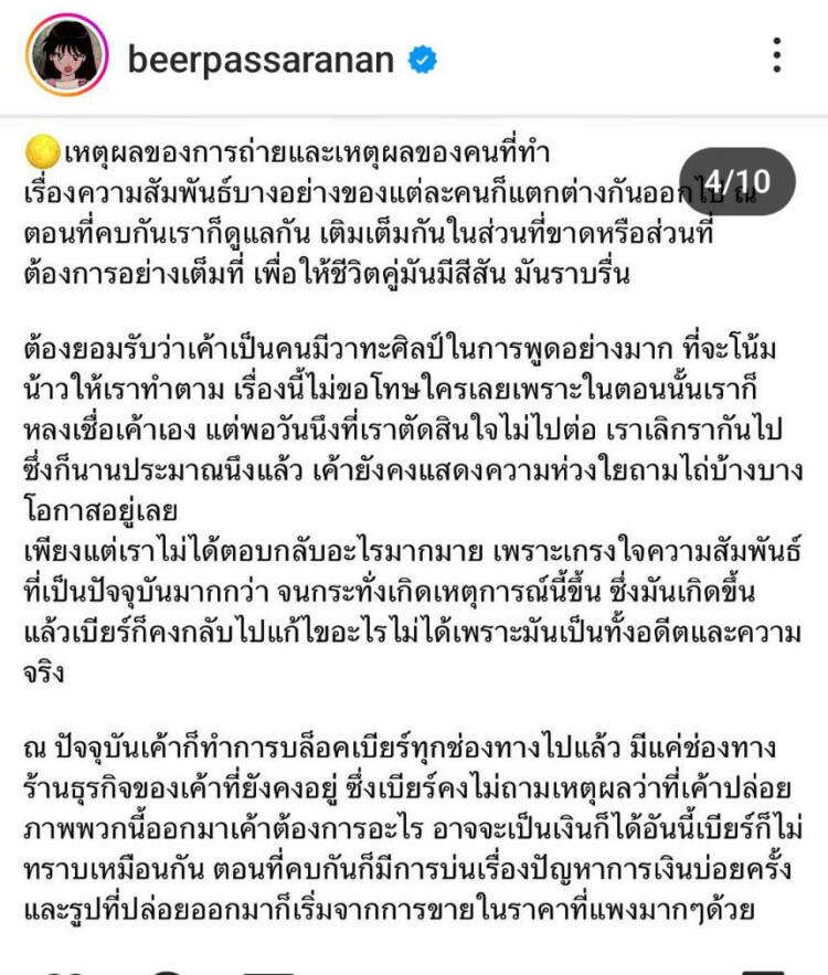 ณ ปัจจุบันเค้าก็ทำการบล็อกเบียร์ทุกช่องทางไปแล้ว มีแค่ช่องทางร้านธุรกิจของเขาที่ยังคงอยู่ ซึ่งเบียร์คงไม่ถามเหตุผลว่าที่เขาปล่อยภาพพวกนี้ออกมาเขาต้องการอะไร อาจจะเป็นเงินก็ได้อันนี้เบียร์ก็ไม่ทราบเหมือนกัน ตอนที่คบกันก็มีการบ่นเรื่องปัญหาการเงินบ่อยครั้ง และรูปที่ปล่อยออกมาก็เริ่มจากการขายในราคาที่แพงมากๆ ด้วย