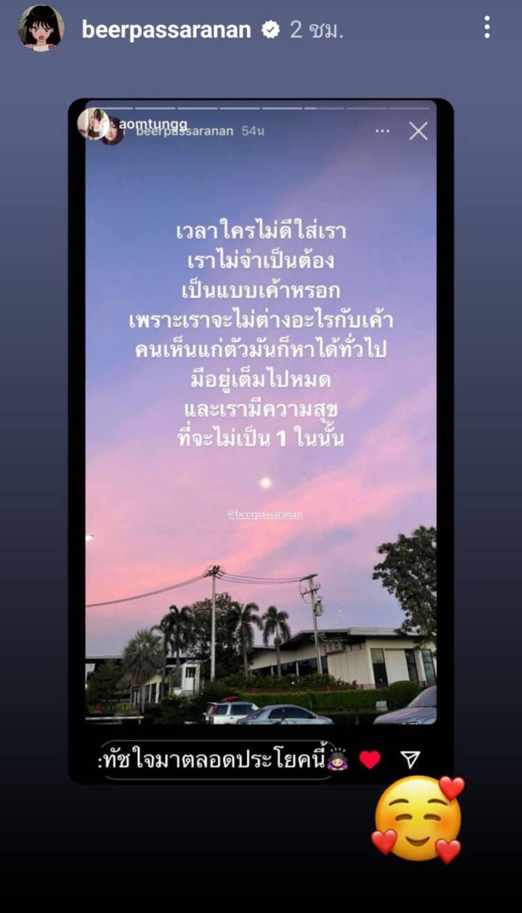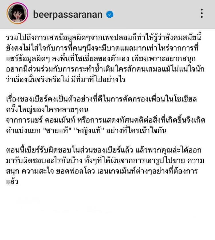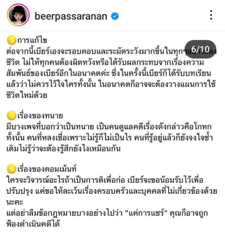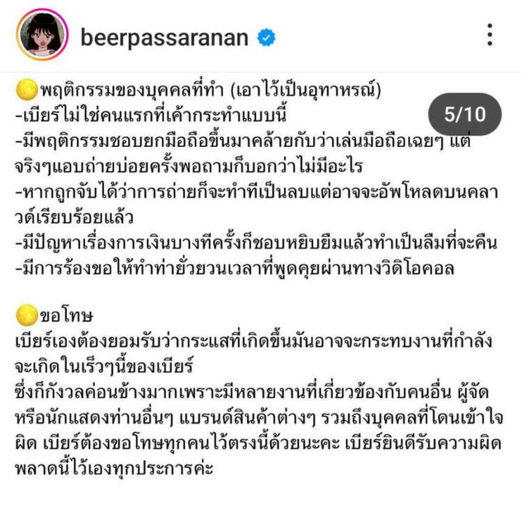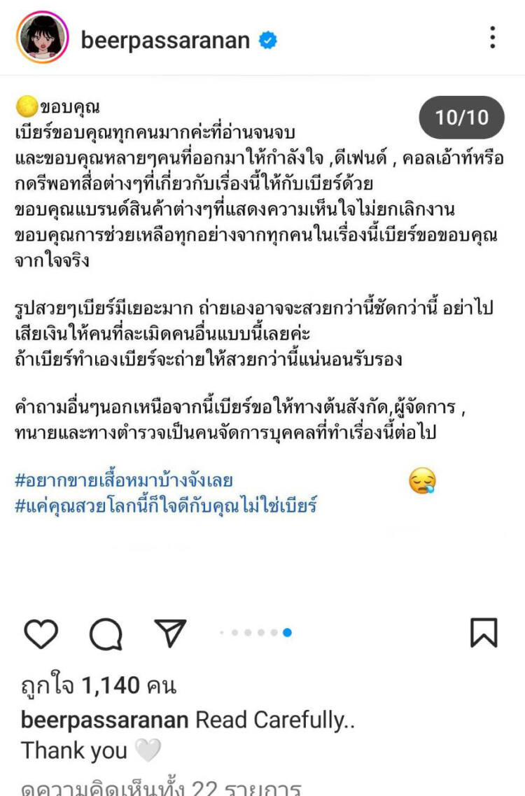 เบียร์เองต้องยอมรับว่ากระแสที่เกิดขึ้นมันอาจจะกระทบงานที่กำลังจะเกิดในเร็วๆ นี้ของเบียร์ ซึ่งก็กังวลค่อนข้างมากเพราะมีหลายงานที่เกี่ยวข้องกับคนอื่น ผู้จัด หรือนักแสดงท่านอื่นๆ แบรนด์สินค้าต่างๆ รวมถึงบุคคลที่โดนเข้าใจผิด เบียร์ต้องขอโทษทุกคนไว้ตรงนี้ด้วยนะคะ เบียร์ยินดีรับความผิดพลาดนี้ไว้เองทุกประการค่ะ